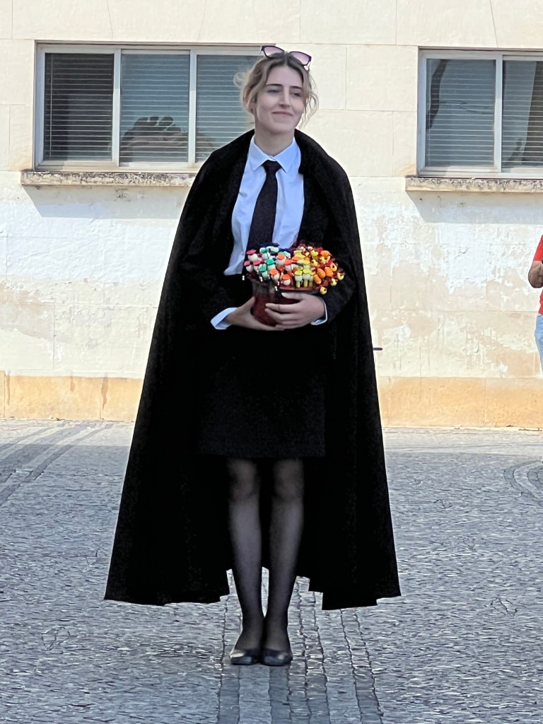 After University of Coimbra, we stopped for lunch at Republica da Saudade, where we experienced one of the robe rituals first hand! The restaurant was staffed by university students, and as we entered the restaurant, there were two students, one on each side just inside the door, holding their robes so that they fell on the floor in front of them and you had no choice but to walk on them to get into the restaurant. Having your robe walked on is an honor.