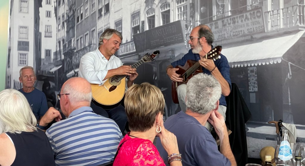 For me, lunch was a wonderful Cod casserole, ice cream and sparkling wine, while listening to Fado Music performed by the restaurant owner and friends. It was beautiful! I don’t have a recording of what we heard, but this recording is by the same group.