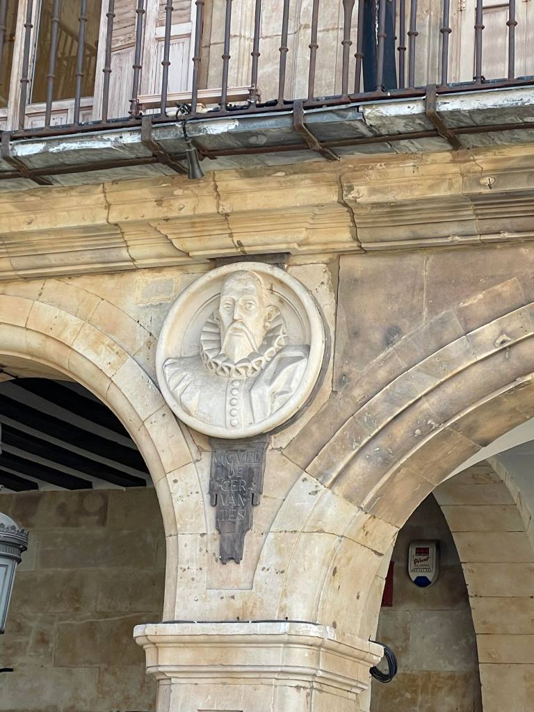 Francisco Franco Bahamonde was a Spanish dictator who led the Nationalist forces in overthrowing the Second Spanish Republic during the Spanish Civil War. He ruled over Spain from 1939 to 1975. Since his passing in 1975, there has been an effort to remove all references to his face and name in public view. You’ll see an example of that in the last picture in the slide deck below, where his face has been removed from the medallion on the pillar on the left, but the face of Miguel de Cervantes Saavedra, who was the Spanish writer known for Don Quixote, remains on the pillar on the right.