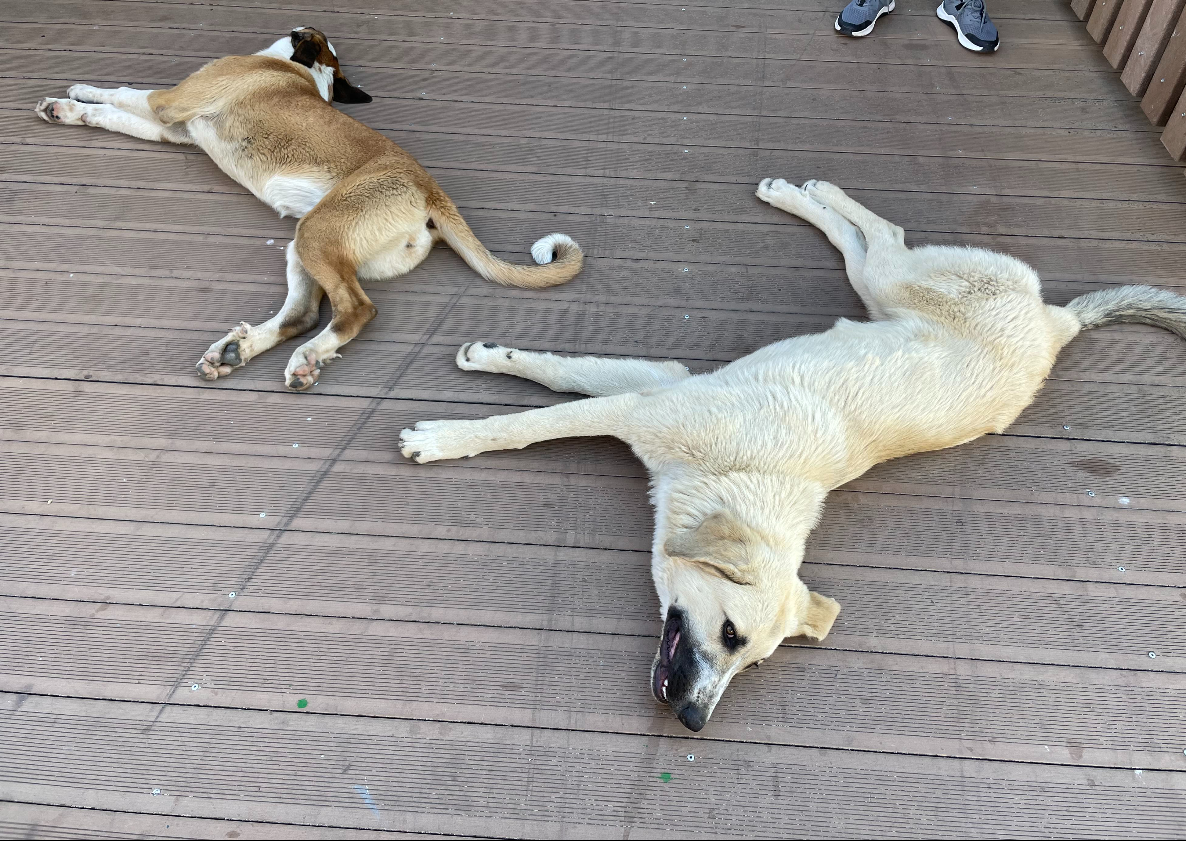 OMG! I almost forgot one of the best parts of the whole day the dogs of Portugal! They are everywhere! In the streets, sleeping in doorways, nobody owns them, they just live there, and people feed them. These two snoozers were waiting on the ramp to the boat when we returned: