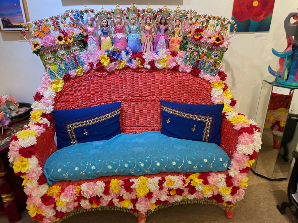 Our next stop was the Taos Pueblo, a living Native American community that has been continuously inhabited for over 1,000 years. There was some rehab work happening on the exterior of the church while we were there. Several huts had signs out indicating they had crafts for sale. I purchased an original painting by an artist who has lived there his whole life. The painting is a beautiful night view of his grandmother’s hut, highlighting the adobe of the hut, with a string of red peppers hanging outside the door, against a deep blue sky full of shooting stars.