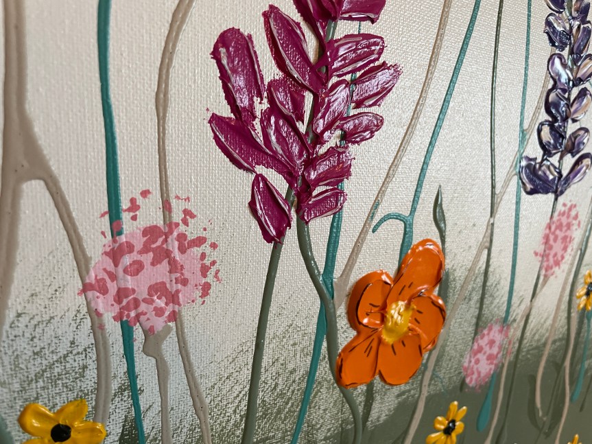 Last weekend, I did my first live art show in probably ten years, and it felt wonderful! I was excited to get some of my new work out into the world and dip my toes into the live show experience. I came away, elated! People commented on the deep textures and bright colors I use in my floral paintings. They enjoyed their whimsical feel. I loved hearing what people had to say. I felt validated!