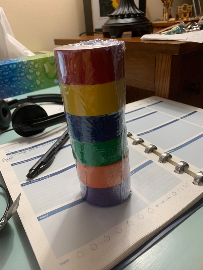 Over the past several weeks I’ve been receiving packages from Amazon for things I haven’t ordered. First a bunch of rolls of tape in bright colors, next a bunch of rolls of twine in bright colors, then a set of five clear plastic sleeves that you might slide a piece of paper into, each one bound on the edges in a different…bright color.